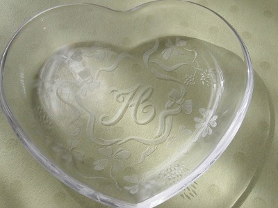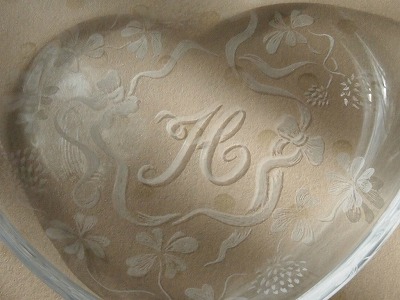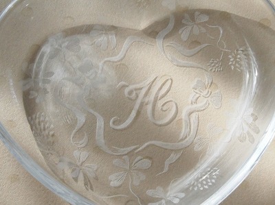 | ハート型プレートにイニシャルを彫ります。 図案を写す作業からスタートしますので、グラスリッツェンの全工程を体験していただくことができます。 イニシャルと模様は図案集を見ながら相談して選んでいきますので、オリジナル作品を作ることができます。 写真は作品例です。サイズ:12cm×10.6cm×高さ2cm |